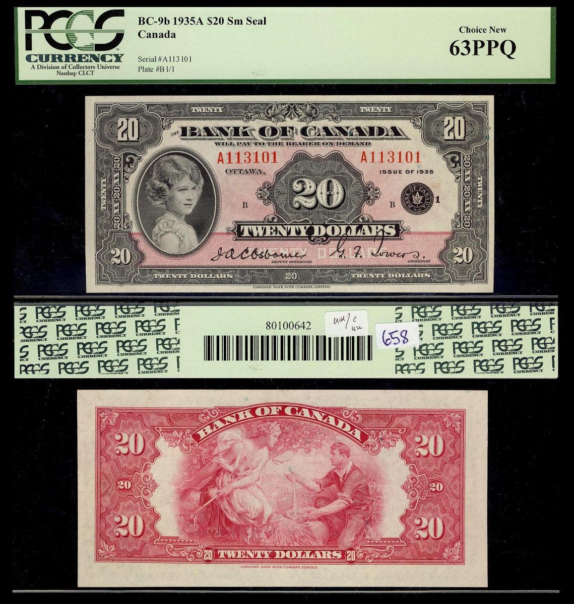 1935 $20 BC-9b #A113101 PCGS CH UNC63. Well centered with bright and vibrant colours. Very rare in this choice condition. Worth a premium bid.