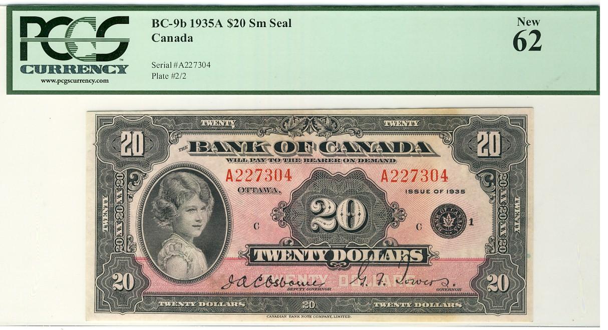 1935 $20 BC-9b ~A227304, PCGS UNC62. A super example with full colour. Lightly offcut top border and very light yellow stain in top border. Does not hinder the overall look of this attractive note.