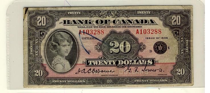 1935 $20 BC-9b Eng #A103288. VG in grade with minor crayon marking and stain.