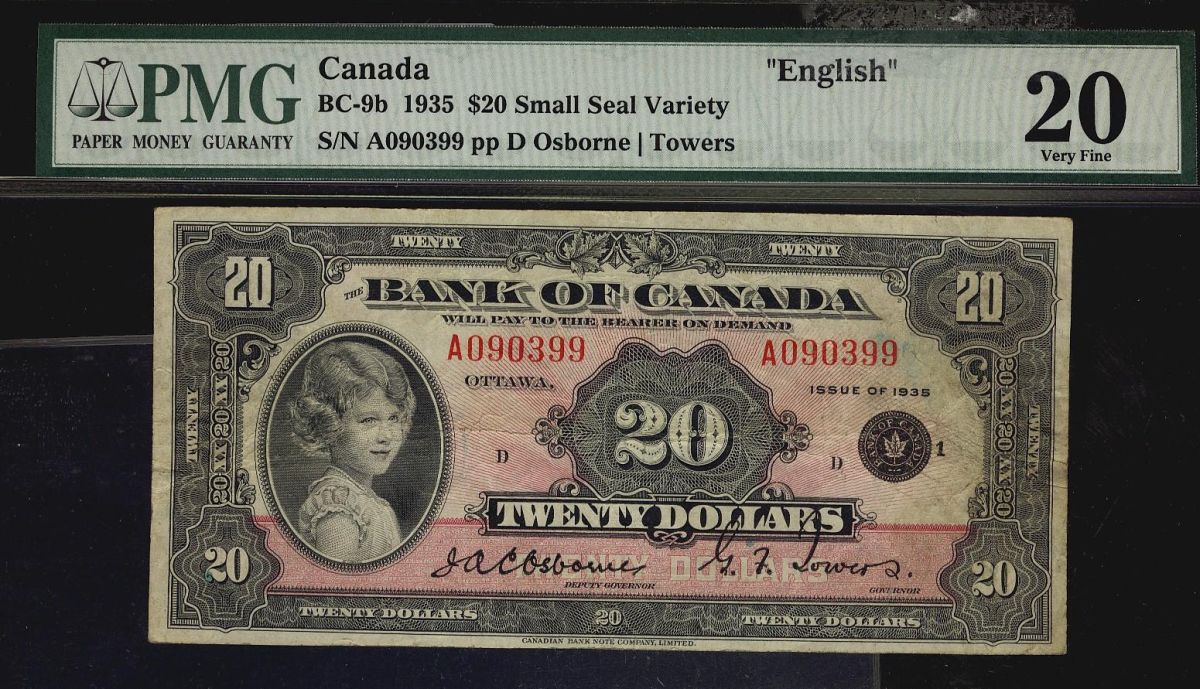 1935 $20 BC-9b Small seal S/N A090399 pp D PMG VF20