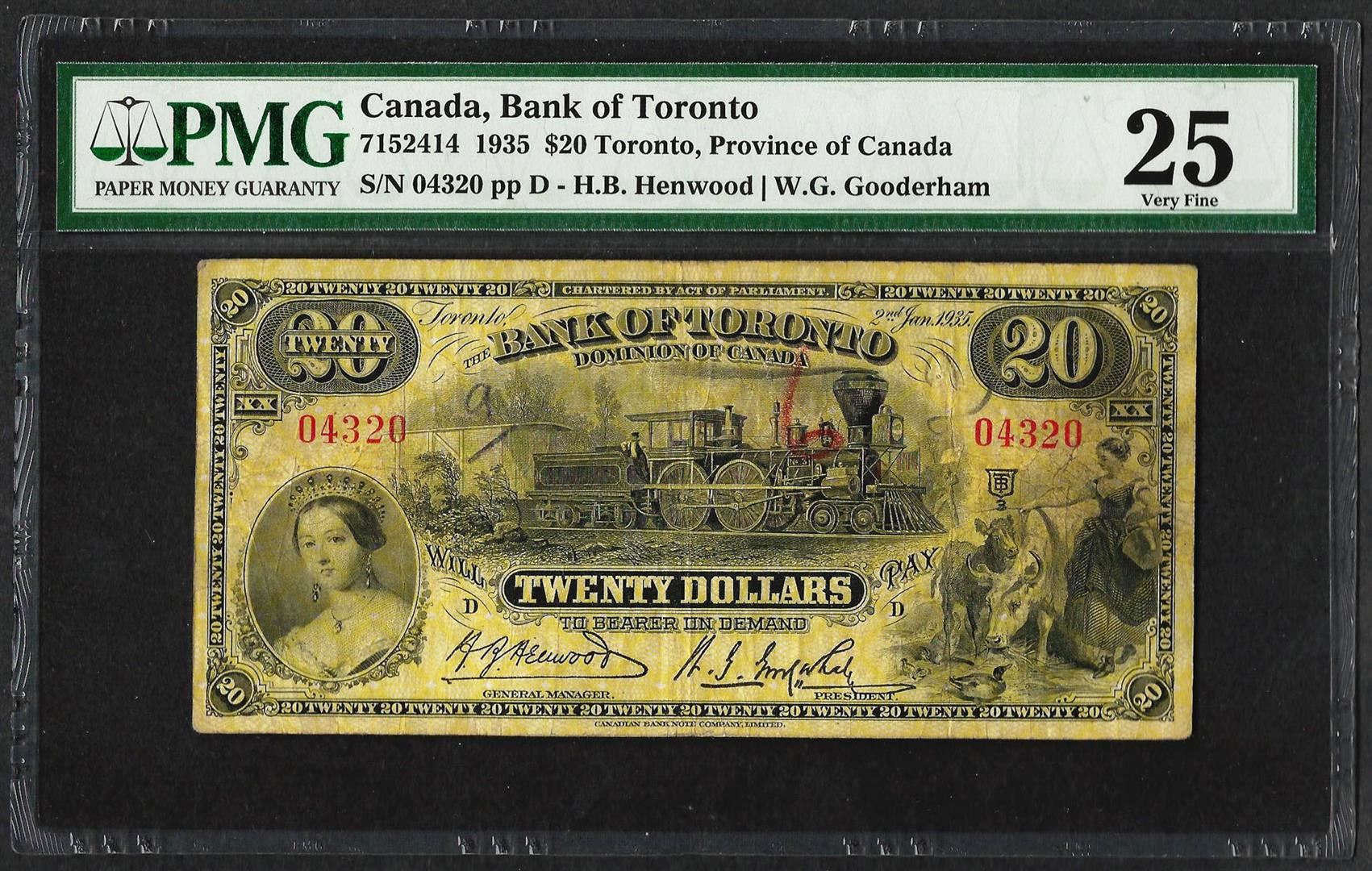 One 1935 $20 Bank of Toronto, Canada Note PMG Very Fine 25. PMG Certified.