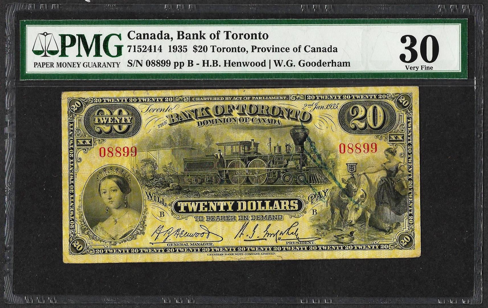 One 1935 $20 Bank of Toronto, Canada Note PMG Very Fine 30. PMG Certified.