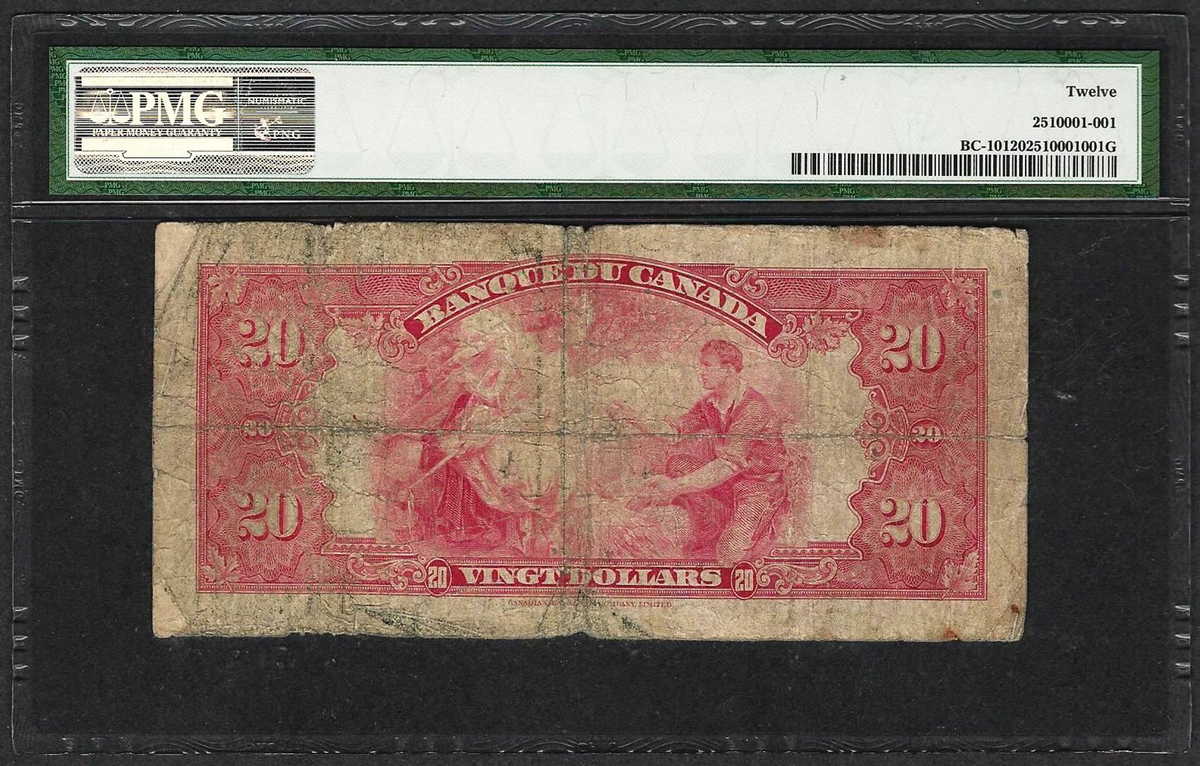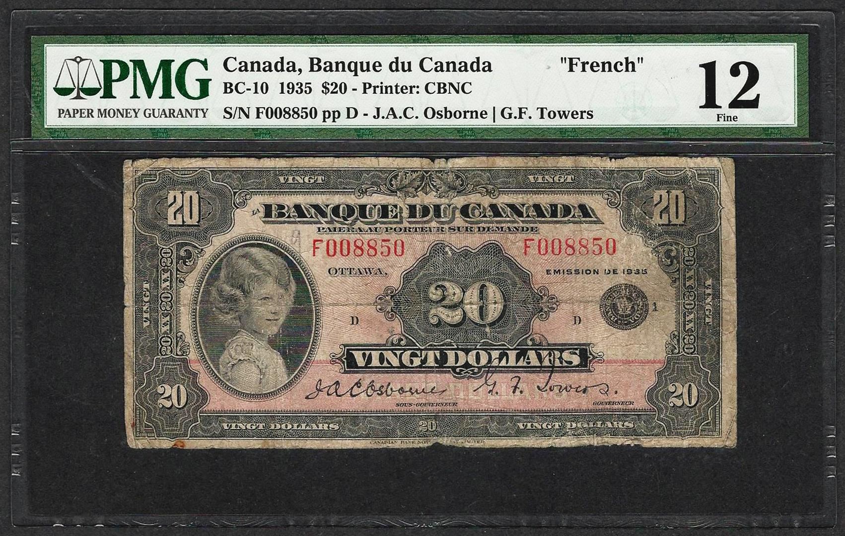 One 1935 $20 Banque du Canada "French" Bank Note BC-10 PMG Fine 12. PMG Certified.