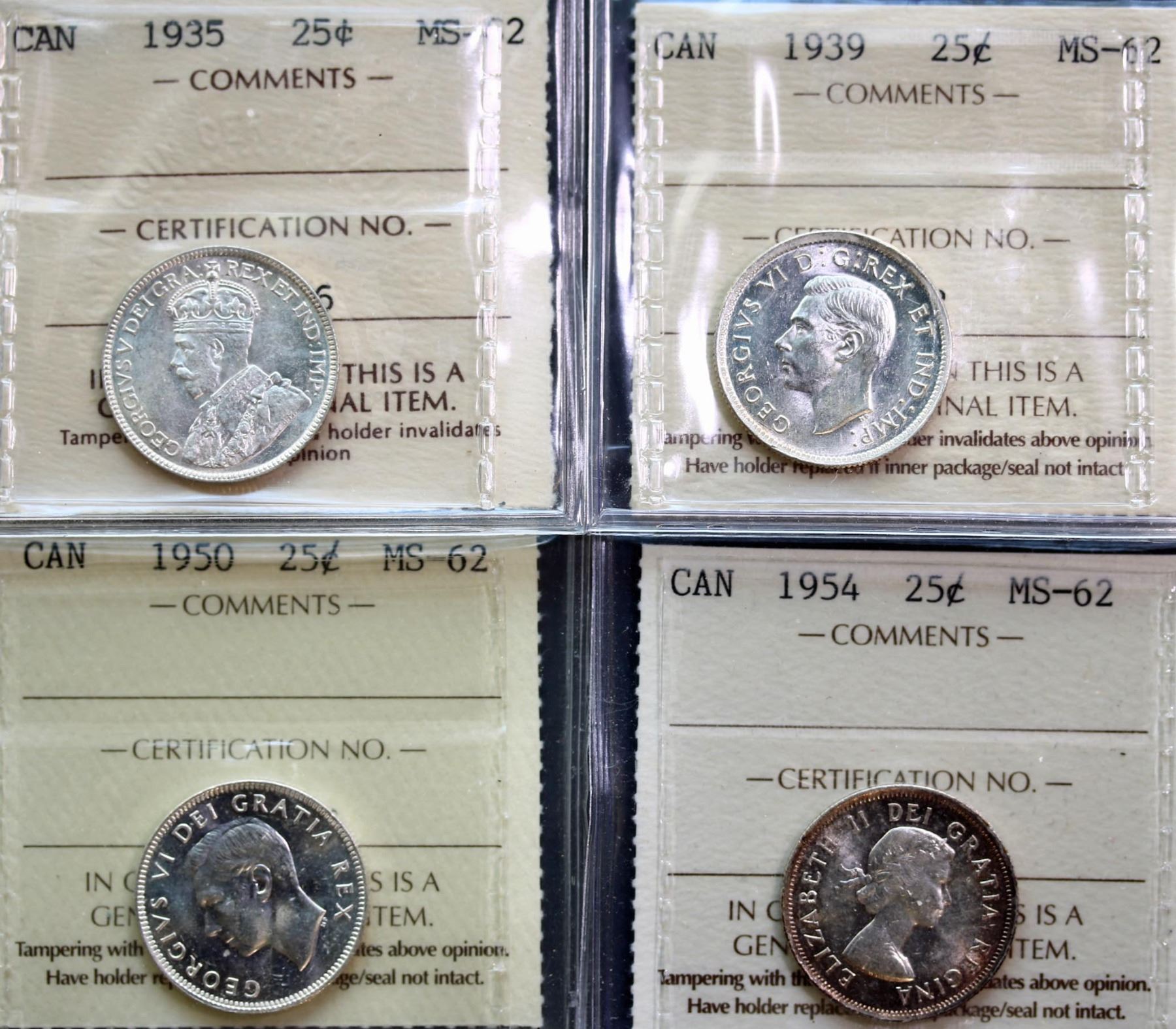 1935 25¢, 1939, 1950, and 1954, all ICCS Choice Mint State-62, lot of 4 coins.