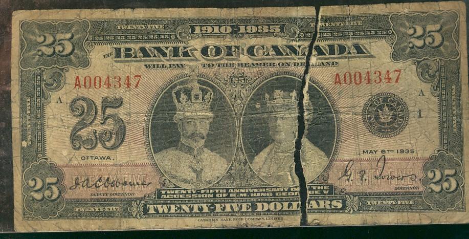 1935 $25 BC-11 #A004347. Rare and popular issue, looks like a solid VG is but is torn in half. Should be viewed.
