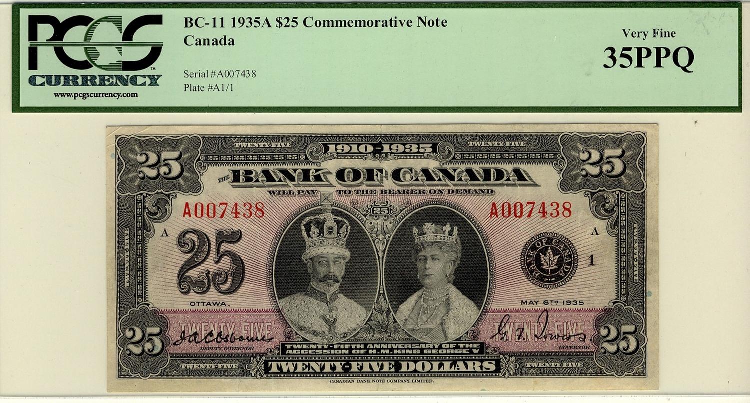 1935 $25 BC-11 #A007438, PMG VF35PPQ. Great colours and centering. Very desirable.