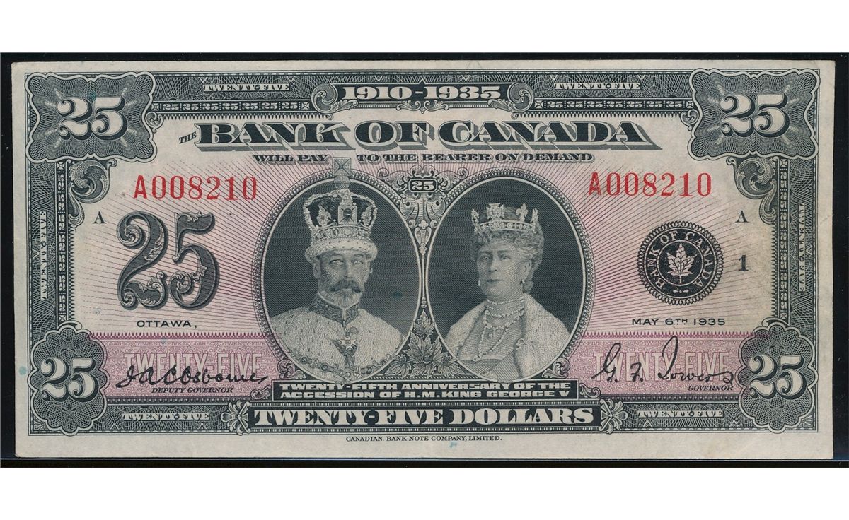 1935 $25 BC-11 #A008210. Scarce VF issue. A few minor internal pinholes.