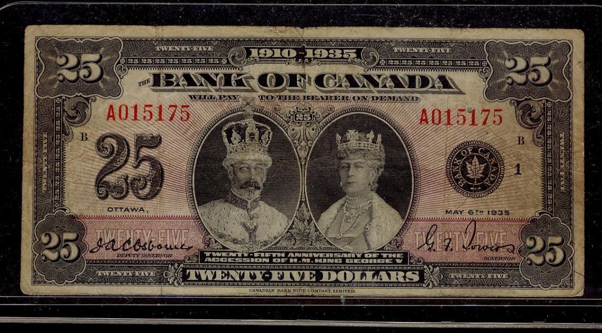 1935 $25 BC-11 #A015175. Popular issue in VG-F condition.