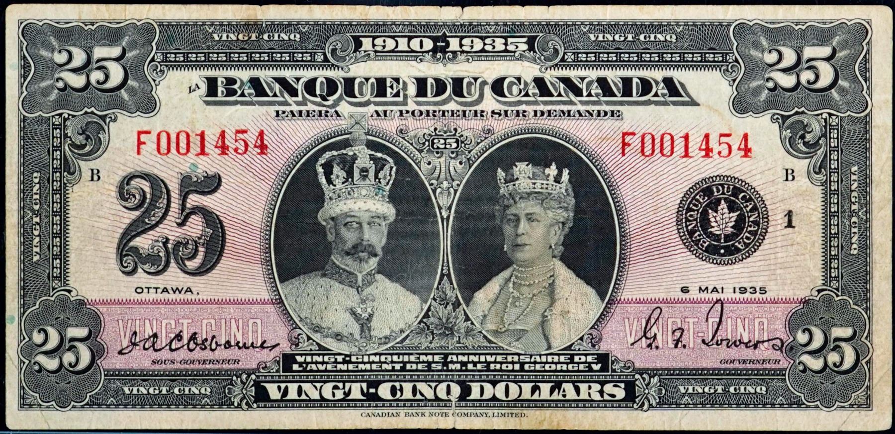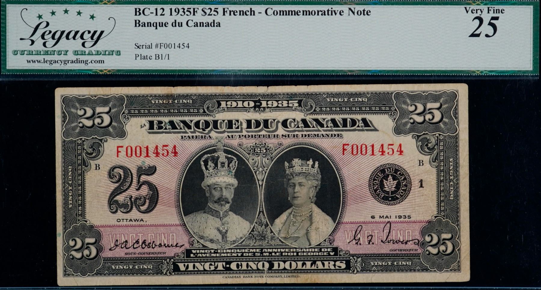 1935 $25 BC-12 #F001454, LCG Choice Very Fine-25. minor issues. Rare French issue.