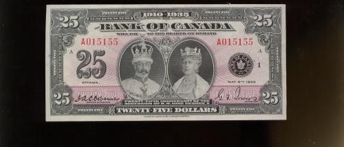 1935 $25 english Text A015155. Original uncirculated with a light counting crease. Well centered and bright! Rare and very attractive.