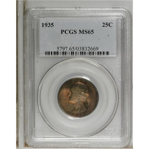 <B>1935 25C MS65 PCGS.</B></I> PCGS Population (784/602). NGC Census: (420/656). Mintage: 32,484,000. Numismedia Wsl. Price for NGC/PCGS coin in MS65: $90. (#5797)<BR><BR><b>Shipping:</b> Coins & Currency (<a target="_blank" href="http://www.heritageauctions.com/common/shipping.php">view shipping information</a>)