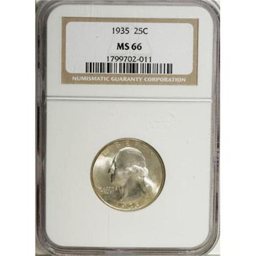 <B>1935 25C MS66 NGC.</B></I> NGC Census: (550/115). PCGS Population (539/76). Mintage: 32,484,000. Numismedia Wsl. Price for NGC/PCGS coin in MS66: $145. (#5797)<BR><BR><B>Coin Engraver:</B> John Flanagan<BR><BR><b>Shipping:</b> Coins & Currency (<a target="_blank" href="http://www.heritageauctions.com/common/shipping.php">view shipping information</a>)