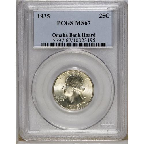 <B>1935 25C MS67 PCGS.</B></I> Ex: Omaha Bank Hoard. A remarkably well-preserved and solidly struck Superb Gem that has flashy luster. PCGS has graded just one coin finer (10/06).<BR><BR><b>Shipping:</b> Coin/Currency (<a target="_blank" href="http://www.heritageauctions.com/common/shipping.php">view shipping information</a>)