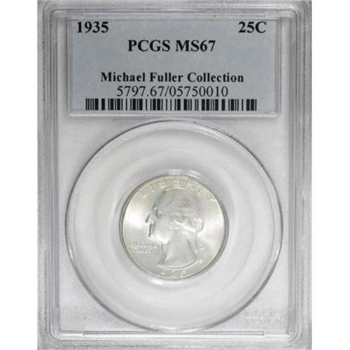 <B>1935 25C MS67 PCGS.</B></I> A great early Washington quarter. Well struck, lustrous, and near-pristine, with a coating of milky greenish-white color on each side and some brownish toning noted on the eagle's breast and legs. Population: 75 in 67, 1 finer (8/07). <BR><I>From The Michael Fuller Collection.</B></I><BR><BR><B>Coin Engraver:</B> John Flanagan<BR><BR><b>Shipping:</b> Coins & Currency (<a target="_blank" href="http://www.heritageauctions.com/common/shipping.php">view shipping information</a>)