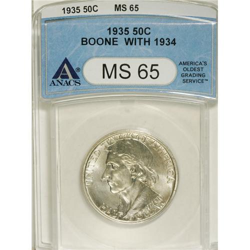 <B>1935/34 50C Boone MS65 ANACS.</B></I> NGC Census: (926/522). PCGS Population (579/244). Mintage: 10,008. Numismedia Wsl. Price for NGC/PCGS coin in MS65: $240. (#9262)<BR><BR><b>Shipping:</b> Coins & Currency (<a target="_blank" href="http://www.heritageauctions.com/common/shipping.php">view shipping information</a>)