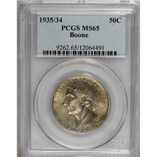 <B>1935/34 50C Boone MS65 PCGS.</B></I> PCGS Population (586/251). NGC Census: (471/264). Mintage: 10,008. Numismedia Wsl. Price for NGC/PCGS coin in MS65: $240. (#9262)<BR><BR><b>Shipping:</b> Coins & Currency (<a target="_blank" href="http://www.heritageauctions.com/common/shipping.php">view shipping information</a>)