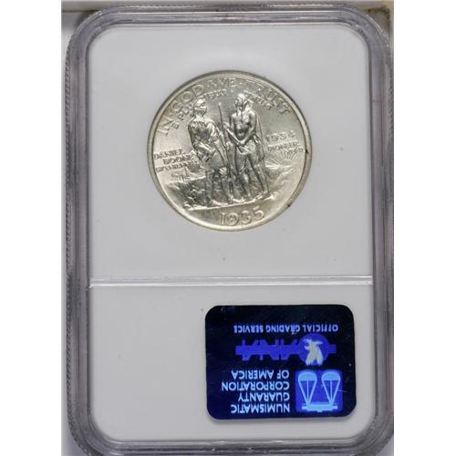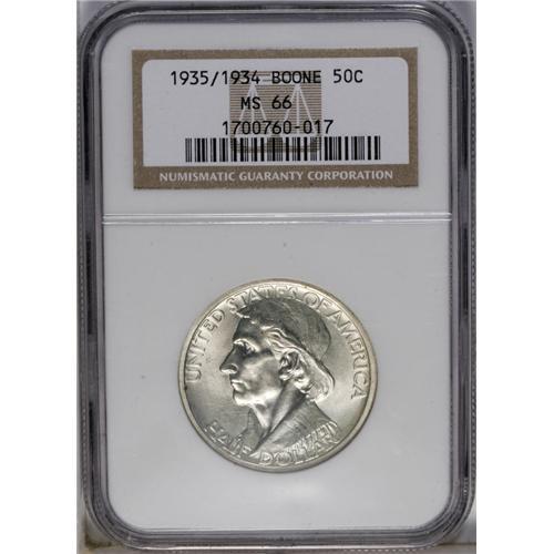 <B>1935/34<50C> Boone MS66 NGC.</B></I> The lustrous surfaces have mellowed with time; hazy yet attractive patina lightly covers both sides. A few small spots of dark toning limit the grade.