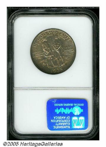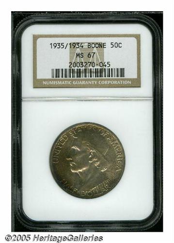 <B>1935/34<50C> Boone MS67 NGC.</B></I> Attractive violet and green color accentuates the obverse of this example. Attractively lustrous with matte-like reverse, very well preserved. Population: 36 in 67, 0 finer (6/05).