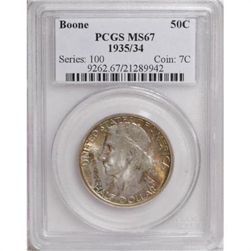 <B>1935/34 50C Boone MS67 PCGS.</B></I> Beautiful aquamarine and sun-gold patina illuminates this lustrous and penetratingly struck Superb Gem. Carefully preserved and highly attractive.<BR><I>From The Cary & Cheryl Porter Collection, Part Three.</B></I><BR><BR><b>Shipping:</b> Coins & Currency (<a target="_blank" href="http://www.heritageauctions.com/common/shipping.php">view shipping information</a>\)