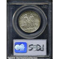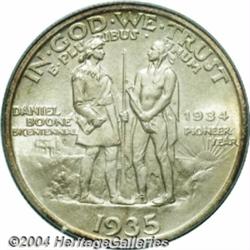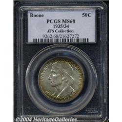 <B>1935/34<50C> Boone MS68 PCGS.</B></I> Satiny, pale silver and steel-green surfaces are surrounded on the obverse by rich crimson, golden-orange, and lime-green patina, with just a hint of marginal color on the reverse. The striking details are unquestionably full and complete, and matte-like surface textures, combined with the obviously original coloration, give this unsurpassed and nearly unimprovable piece a pleasing antique appearance. An outstanding Boone type coin. Population: 2 in 68, 0 finer (6/04).<BR><I>Ex: New York Signature Sale (Heritage, 7/02), lot 5054, which realized $18,400.</B></I><BR><I>From the JFS Collection, the #1 All-Time PCGS Registry Set.</B></I> <BR><BR><B>Important notice:</B> Heritage usually auctions material at the rate of 200-250 lots per hour. On some occasions eBay Live bid software or the Internet may not be able to keep up with the pace of the auction. We recommend placing a realistic absentee bid now as insurance to avoid disappointment. Occasionally the auctioneer may eliminate or reject an eBay Live bid, and the auctioneer may also reopen a lot after the close of the eBay live bidding (usually because we missed an audience bid), and may reject your bid even if it shows you as the winning bidder. By bidding via eBay Live, you agree that Heritage may award the lot to another bidder at its sole discretion under the circumstances described above or any other reasonable circumstances. Since eBay bids are not shown to us until we open the lot on the floor, we treat those bids just like floor bids. In most cases the floor responds before the eBay bid is presented to us, due to Internet lag time, so for consistency we have made it a policy that floor bids are always considered first over tie eBay live bids. Also please note that all Heritage lots purchased through eBay Live carry a 20% Buyer's Premium. Please make sure you read the Terms and Conditions before you bid. </span></font></tr></table></td></tr></table>