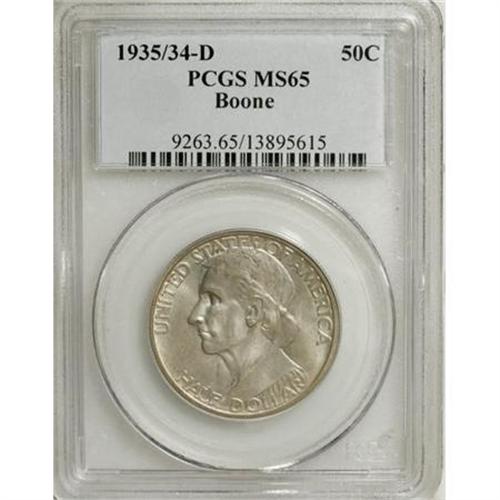 <B>1935/34-D 50C Boone MS65 PCGS.</B></I> PCGS Population (222/199). NGC Census: (136/174). Mintage: 2,003. Numismedia Wsl. Price for NGC/PCGS coin in MS65: $675. (#9263)<BR><I>From The Frank DuVall Collection of U.S. Commemoratives.</B></I><BR><BR><b>Shipping:</b> Coins & Currency (<a target="_blank" href="http://www.heritageauctions.com/common/shipping.php">view shipping information</a>\)