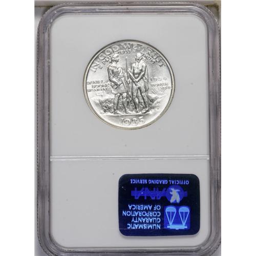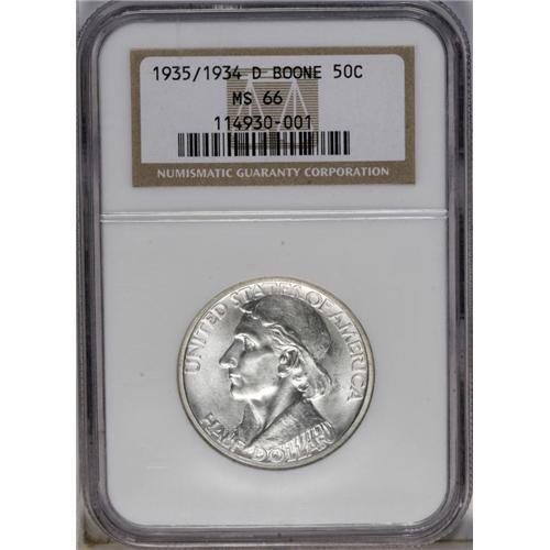 <B>1935/34-D<50C> Boone MS66 NGC.</B></I> This lowest-mintage classic commemorative (2,003 pieces struck) is well represented by the present example, a scarcely toned and satiny coin. Small luster breaks are noted behind Boone's head on the obverse.