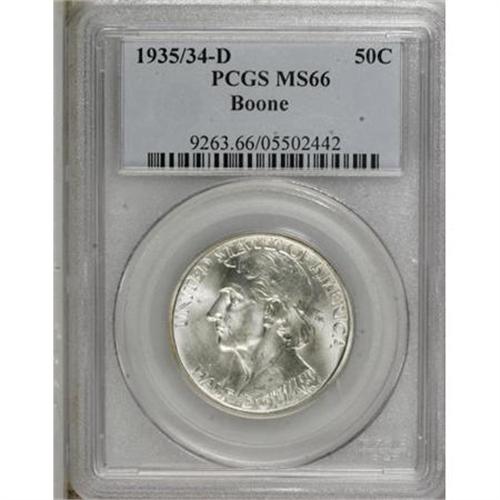 <B>1935/34-D 50C Boone MS66 PCGS.</B></I> PCGS Population (150/54). NGC Census: (110/60). Mintage: 2,003. Numismedia Wsl. Price for NGC/PCGS coin in MS66: $900. (#9263)<BR><BR><b>Shipping:</b> Coins & Currency (<a target="_blank" href="http://www.heritageauctions.com/common/shipping.php">view shipping information</a>)