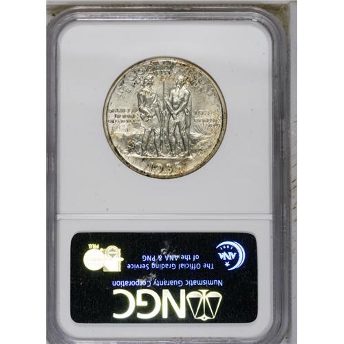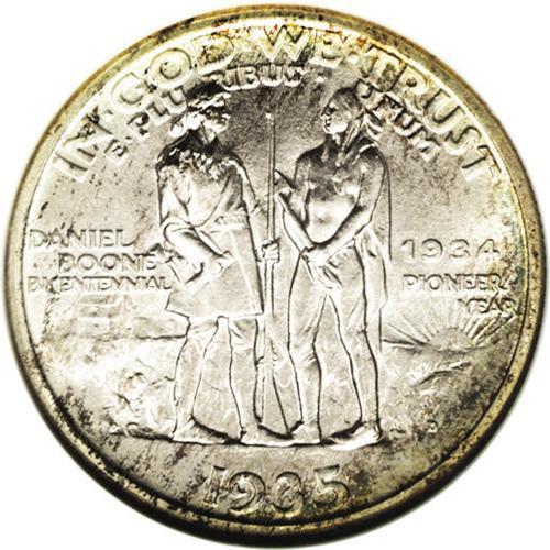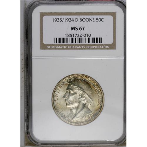 <B>1935/34-D<50C> Boone MS67 NGC.</B></I> Although often confusingly listed (or abbreviated) like an overdate, this is actually a double date coin, with the commemorative year 1934 added in small numbers above PIONEER YEAR--although the original Boone birth year, 1734, is nowhere to be seen. This lush, unabraded Superb Gem example sports a light coating of golden, amber, and sky-blue toning on each side, heavier around the edges, with much luster remaining.