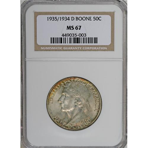 <B>1935/34-D 50C Boone MS67 NGC.</B></I> Orange-gold and lime patina garnish the borders of this otherwise pearl-gray Superb Gem. Satiny and relentlessly smooth. This issue is popular for its inordinately low mintage of 2,003 pieces. Census: 54 in 67, 5 finer (11/06).<BR><BR><b>Shipping:</b> Coin/Currency (<a target="_blank" href="http://www.heritageauctions.com/common/shipping.php">view shipping information</a>)