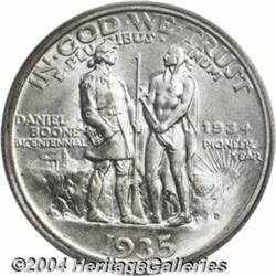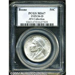 <B>1935/34-D<50C> Boone MS67 PCGS.</B></I> A crisply struck pearl-gray Superb Gem that has wisps of tan color in selected areas. Only a solitary tick on the Indian's leg denies an even higher grade. The 1935-D Boone with 1934 in the field reigns as the lowest mintage Silver Commemorative issue. Just 2,003 pieces were struck, one less than its S-mint counterpart. Contemporary collectors struggling to acquire such pricey issues as the 1935 Hudson had no less than six varieties of 1935-dated Boones to contend with, as the type was struck at all three mints with and without 1934 in the field.<BR><I>From the JFS Collection, the #1 All-Time PCGS Registry Set.</B></I> <BR><BR><B>Important notice:</B> Heritage usually auctions material at the rate of 200-250 lots per hour. On some occasions eBay Live bid software or the Internet may not be able to keep up with the pace of the auction. We recommend placing a realistic absentee bid now as insurance to avoid disappointment. Occasionally the auctioneer may eliminate or reject an eBay Live bid, and the auctioneer may also reopen a lot after the close of the eBay live bidding (usually because we missed an audience bid), and may reject your bid even if it shows you as the winning bidder. By bidding via eBay Live, you agree that Heritage may award the lot to another bidder at its sole discretion under the circumstances described above or any other reasonable circumstances. Since eBay bids are not shown to us until we open the lot on the floor, we treat those bids just like floor bids. In most cases the floor responds before the eBay bid is presented to us, due to Internet lag time, so for consistency we have made it a policy that floor bids are always considered first over tie eBay live bids. Also please note that all Heritage lots purchased through eBay Live carry a 20% Buyer's Premium. Please make sure you read the Terms and Conditions before you bid. </span></font></tr></table></td></tr></table>