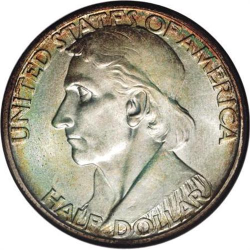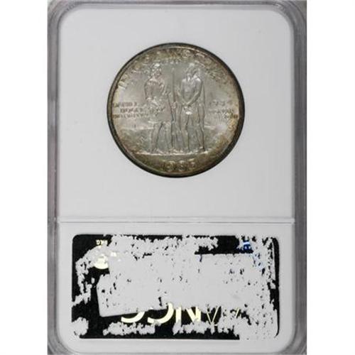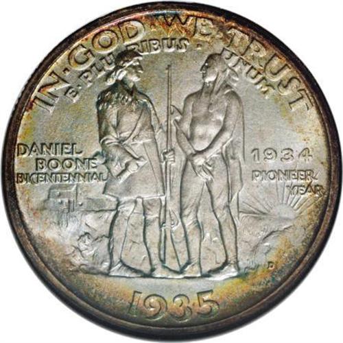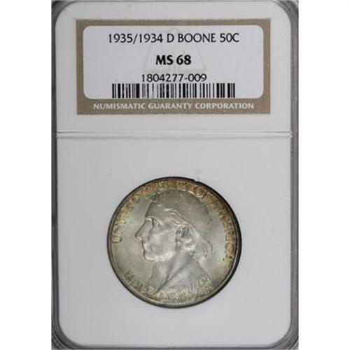 <B>1935/34-D 50C Boone MS68 NGC.</B></I> The famous (or infamous) lowest-mintage classic silver commemorative, represented here by an impeccably preserved example with lovely patina. The satiny surfaces glow beneath soft powder-blue toning in the centers and gold-orange patina at the rims. NGC has awarded an MS68 grade to only five pieces, as of (11/07). <BR><BR><b>Shipping:</b> Coins & Currency (<a target="_blank" href="http://www.heritageauctions.com/common/shipping.php">view shipping information</a>)