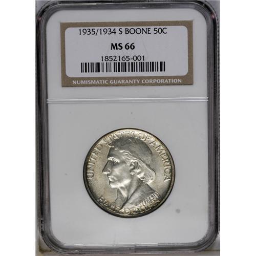 <B>1935/34-S<50C> Boone MS66 NGC.</B></I> Iridescent bands of gold, rose, and powder-blue endow the upper reverse, while light tan-gold toning graces the fields. This satiny and sharply struck Premium Gem has a mark-free reverse and only minor obverse contact.