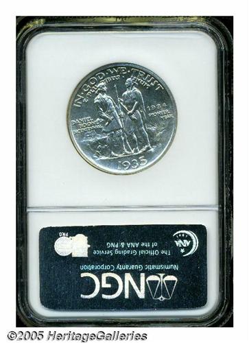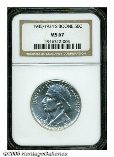<B>1935/34-S<50C> Boone MS67 NGC.</B></I> The silver-white surfaces of this fully struck example are lustrous, and possess a wonderfully matte-like texture, on obverse and reverse alike. Other than the wispiest of slide marks, on Boone's jaw and cheekbone, this beautiful Superb Gem seems pristine. Population: 15 in 67, 5 finer (5/05).