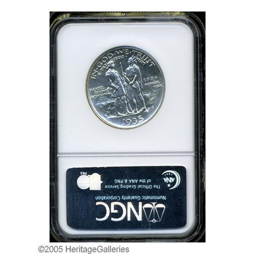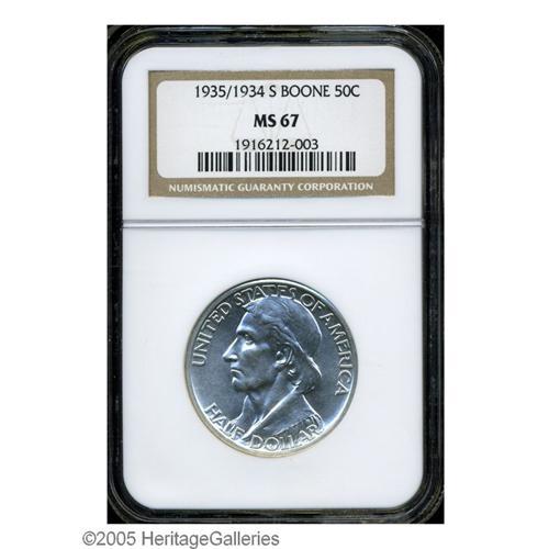 <B>1935/34-S<50C> Boone MS67 NGC.</B></I> The silver-white surfaces of this fully struck example are lustrous, and possess a wonderfully matte-like texture, on obverse and reverse alike. Other than the wispiest of slide marks, on Boone's jaw and cheekbone, this beautiful Superb Gem seems pristine. Population: 15 in 67, 5 finer (9/05).