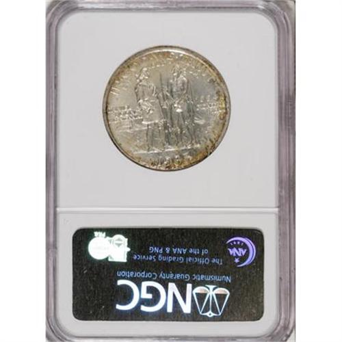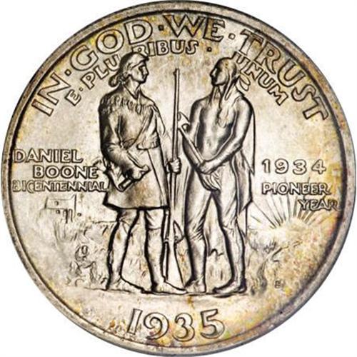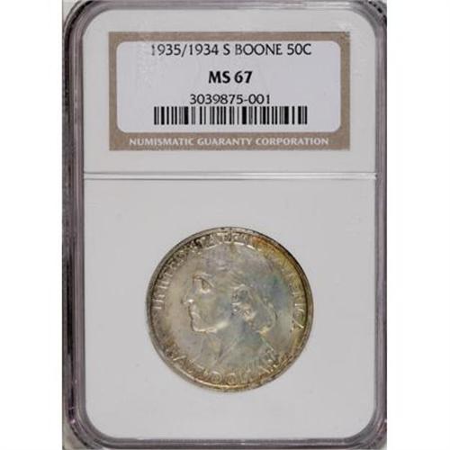 <B>1935/34-S 50C Boone MS67 NGC.</B></I> With one of the lowest mintages in the entire early silver commemorative series, the Boone overdated pieces of 1935 are among the scarcest commemorative coins from the 1930s. This outstanding example is fully struck, with typical satin luster and variegated shades of russet, green, and rose toning on both sides. Census: 17 in 67, 5 finer (11/07). <BR> <BR><BR><b>Shipping:</b> Coins & Currency (<a target="_blank" href="http://www.heritageauctions.com/common/shipping.php">view shipping information</a>)