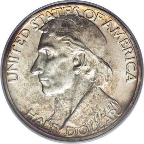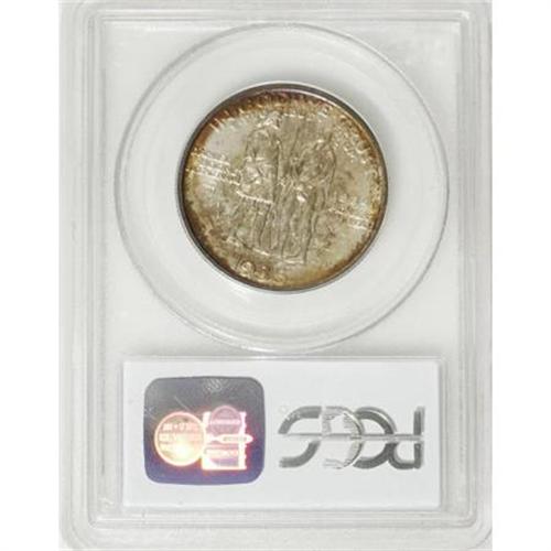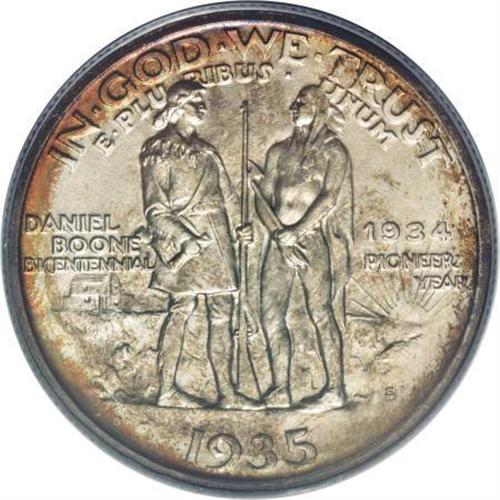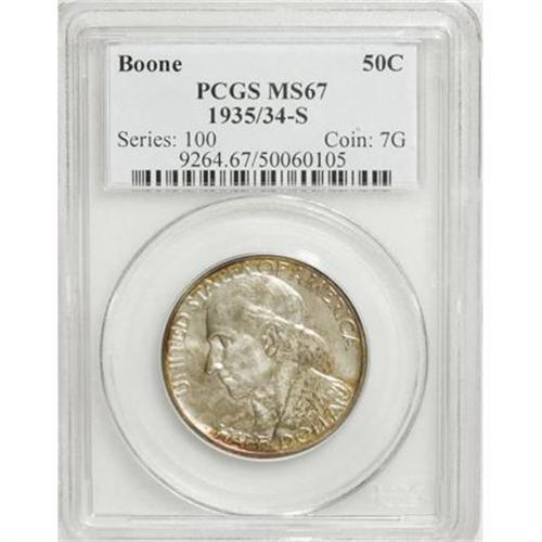 <B>1935/34-S 50C Boone MS67 PCGS.</B></I> One of two infamous Boone issues that fueled the intense speculative mania of 1936, this San Francisco issue had a higher mintage than its Denver counterpart by a single assay coin. The mint frost on this piece still retains a good portion of original brilliance, but each side also shows slightly variegated golden-brown color with bright rose accents around the margins. PCGS has awarded a finer grade to just two examples (11/07).<BR><BR><b>Shipping:</b> Coins & Currency (<a target="_blank" href="http://www.heritageauctions.com/common/shipping.php">view shipping information</a>)