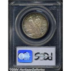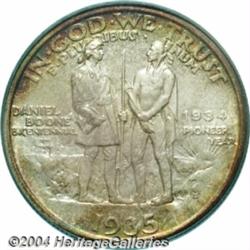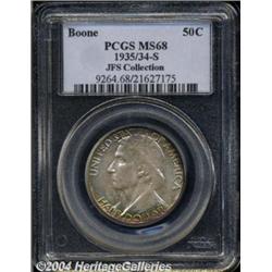 <B>1935/34-S<50C> Boone MS68 PCGS.</B></I> After the Boone Bicentennial Commission was granted authority from Congress in August 1935 to add the 1934 date above PIONEER YEAR on the reverse so as not to confuse the public on the actual year of the bicentennial, the Philadelphia mint made 10,000 pieces with the extra date during October. In November, the San Francisco and Denver mints delivered 2,000 coins apiece with the extra date, which immediately became know as the "Rare Boone's." This S-mint specimen features a blend of powder blue, violet, sea-green, burnt-orange, and crimson coloration that overlies soft, glowing luster. The design features are boldly impressed. A trivial, unobtrusive mark on Boone's cheek, and another on the jaw are mentioned for the sake of accuracy. Population: 2 in 68, 0 finer (6/04).<BR><I>From the JFS Collection, the #1 All-Time PCGS Registry Set.</B></I> <BR><BR><B>Important notice:</B> Heritage usually auctions material at the rate of 200-250 lots per hour. On some occasions eBay Live bid software or the Internet may not be able to keep up with the pace of the auction. We recommend placing a realistic absentee bid now as insurance to avoid disappointment. Occasionally the auctioneer may eliminate or reject an eBay Live bid, and the auctioneer may also reopen a lot after the close of the eBay live bidding (usually because we missed an audience bid), and may reject your bid even if it shows you as the winning bidder. By bidding via eBay Live, you agree that Heritage may award the lot to another bidder at its sole discretion under the circumstances described above or any other reasonable circumstances. Since eBay bids are not shown to us until we open the lot on the floor, we treat those bids just like floor bids. In most cases the floor responds before the eBay bid is presented to us, due to Internet lag time, so for consistency we have made it a policy that floor bids are always considered first over tie eBay live bids. Also please note that all Heritage lots purchased through eBay Live carry a 20% Buyer's Premium. Please make sure you read the Terms and Conditions before you bid. </span></font></tr></table></td></tr></table>