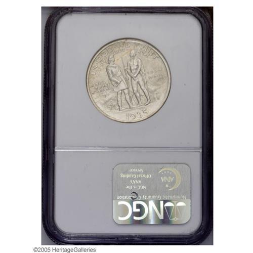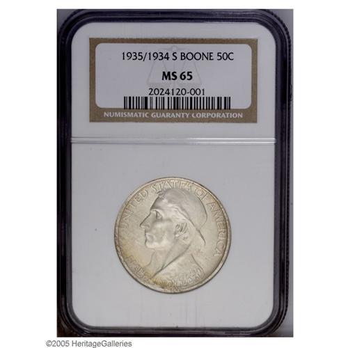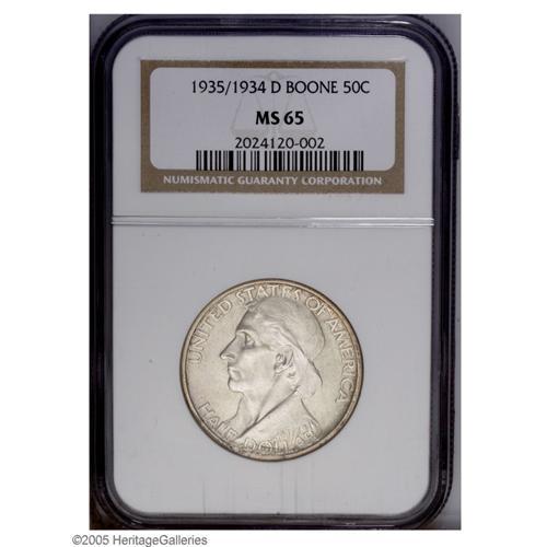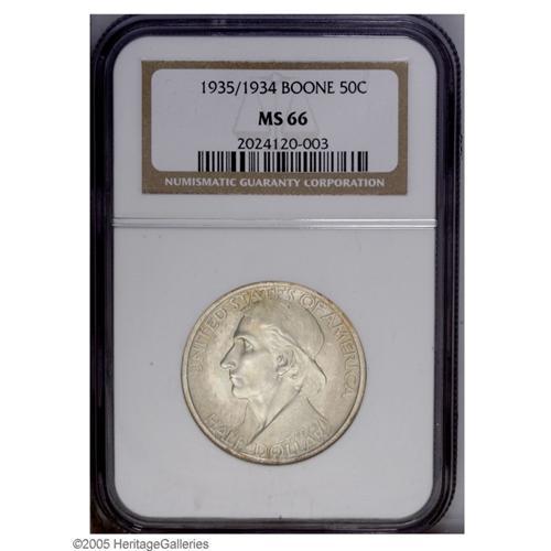 <B>1935/34<SET> Boone PDS Set MS65 to MS66 NGC.</B></I> The set includes: <B>1935/34 MS66,</B></I> fully struck and pristine, with a nearly full coating of opaque, creamy-beige toning over the obverse; <B>1935/34-D MS65,</B></I> crisply detailed with a lovely satiny-smooth appearance, and faint speckled border toning on the obverse; and a <B>1935/34-S,</B></I> creamy luster with slight, streaky apricot coloration on each side, and faint luster grazes on the cheek and jaw of Daniel Boone.