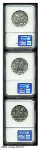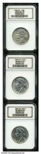 <B>1935/34<SET> Boone PDS Set MS67 NGC.</B></I> The set includes: <B>1935/34,</B></I> deep honey-orange patina, and satiny luster; <B>1935/34-D,</B></I> lustrous, nearly colorless and very well preserved; <B>1935/34-S,</B></I> well struck, virtually pristine, satiny luster, lovely pearl-gray and speckled olive-peach colors. The 1935/34-D and 1935/34-S are the two lowest mintage business strike Silver Commemorative issues. In 1935 six different varieties of this issue were produced, which combined the three mints with reverses with and without the 1934 date above PIONEER YEAR.