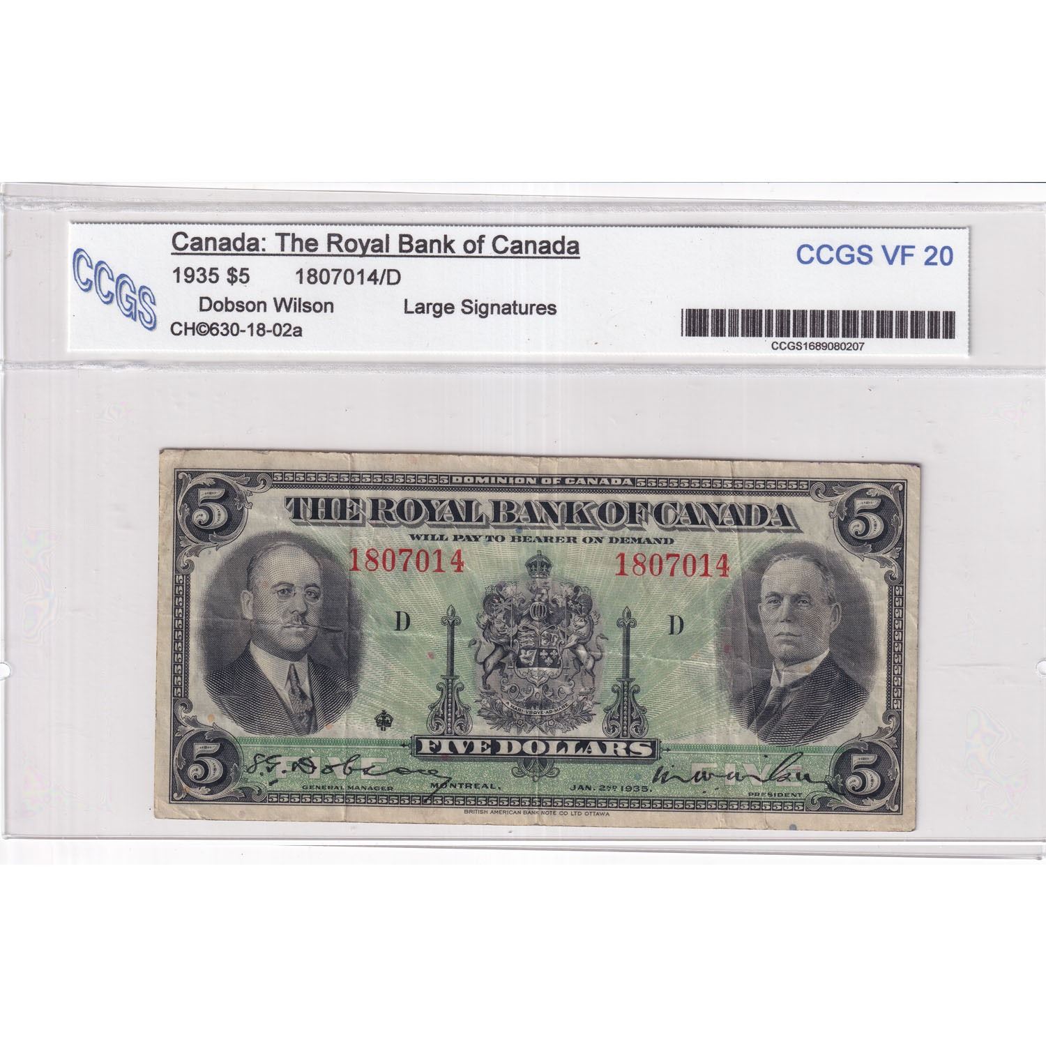 1935 $5 630-18-02a, The Royal Bank of Canada, Dobson-Wilson, Large Signatures, Check Letter D, S/N: 1807014, CCGS Certified VF-20.