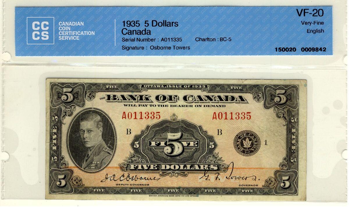 1935 $5 BC-5 #A011335. CCCS VF20.