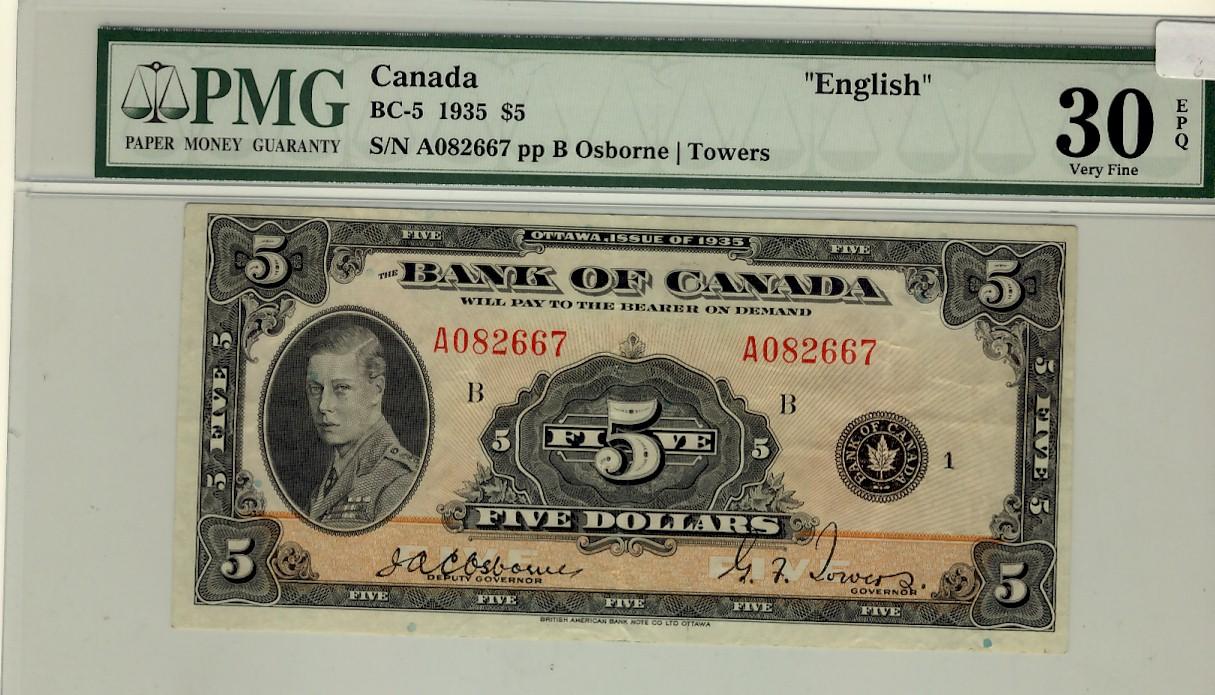 1935 $5 BC-5 #A082667, PMG VF30EPQ.