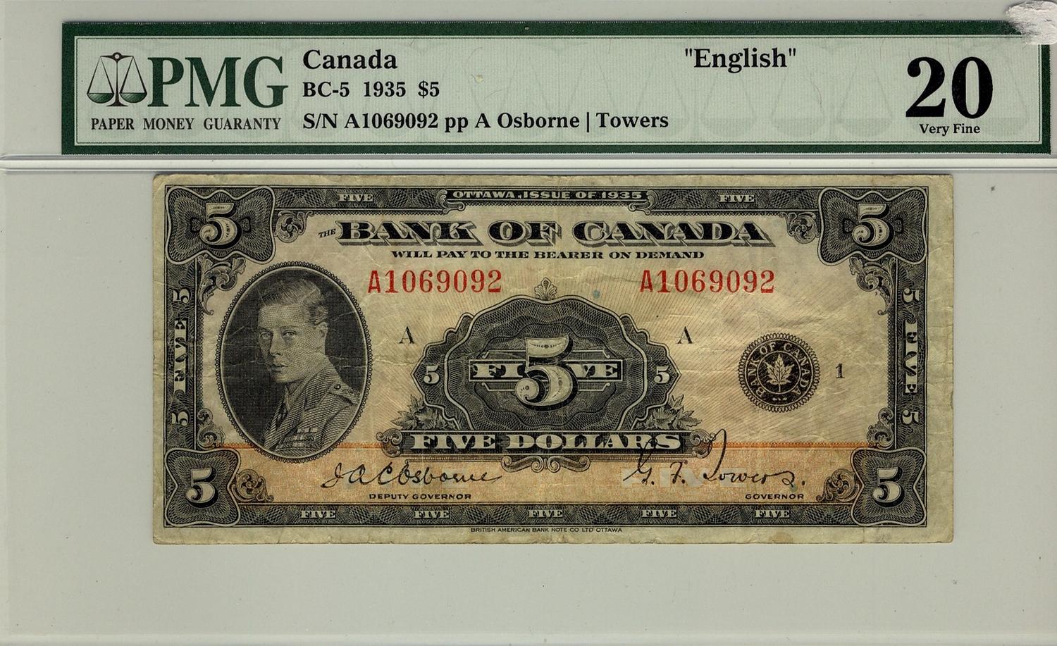 1935 $5 BC-5 #A1069092, PMG VF20.