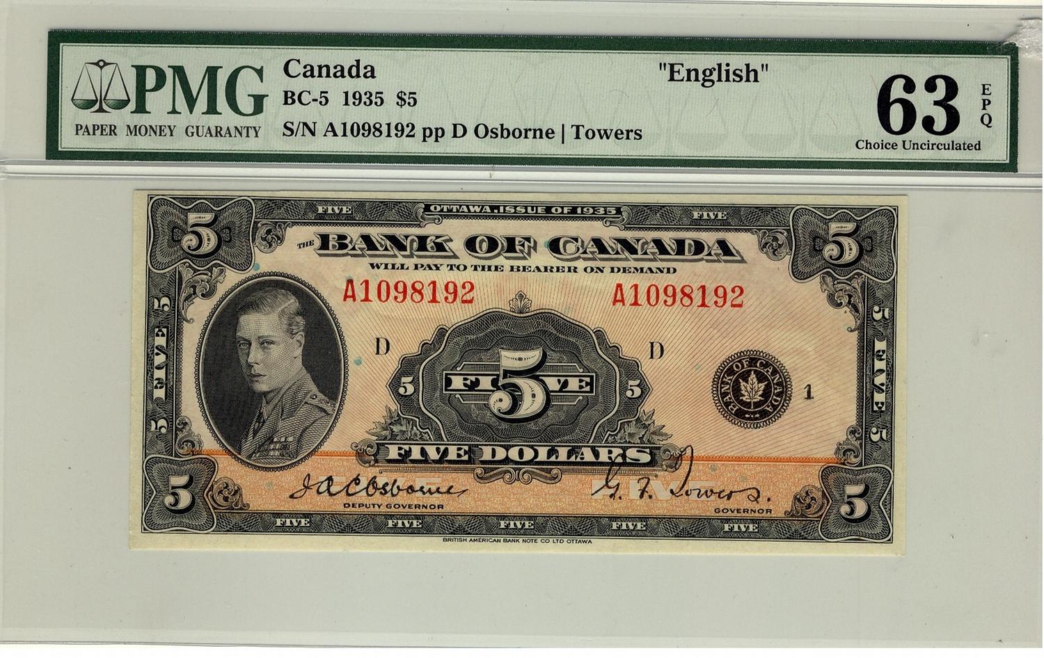 1935 $5 BC-5 #A1098192, PMG CH UNC63EPQ. Scarce this nice.