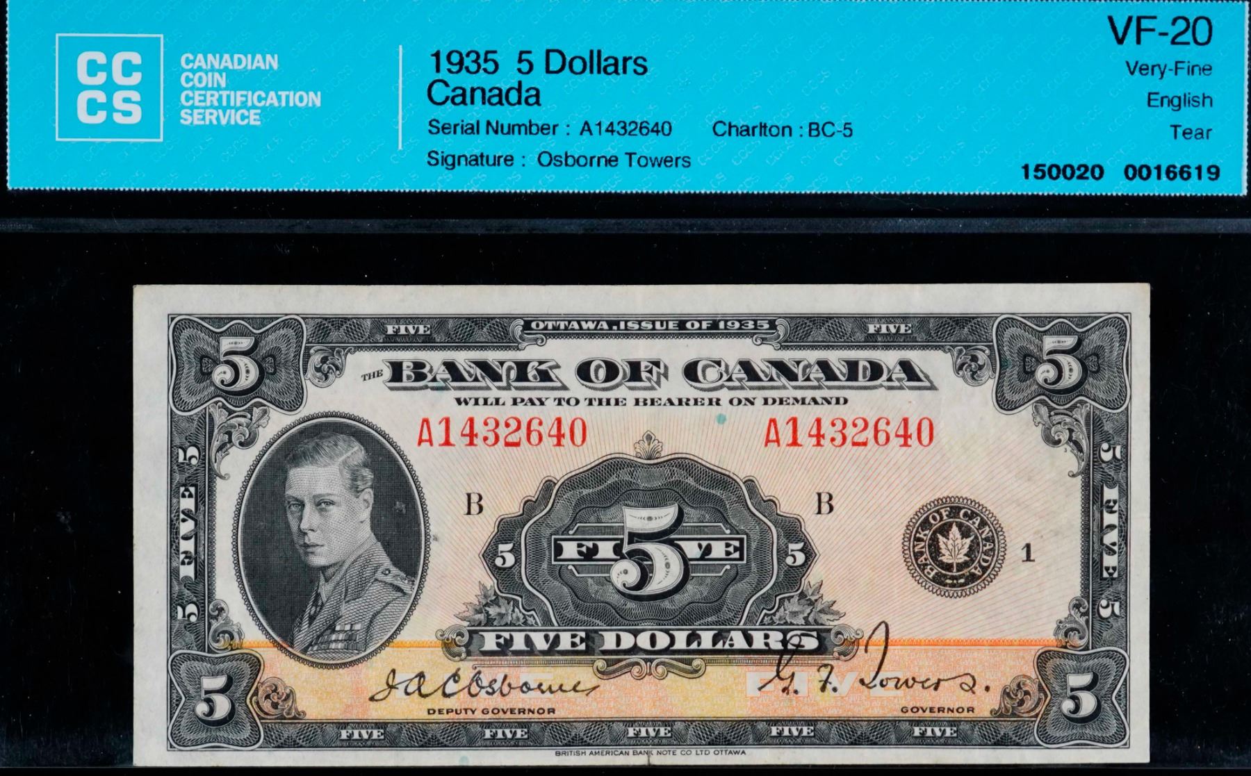 1935 $5 BC-5 #A1432640 CCCS Very Fine-20 A nice and bright example.