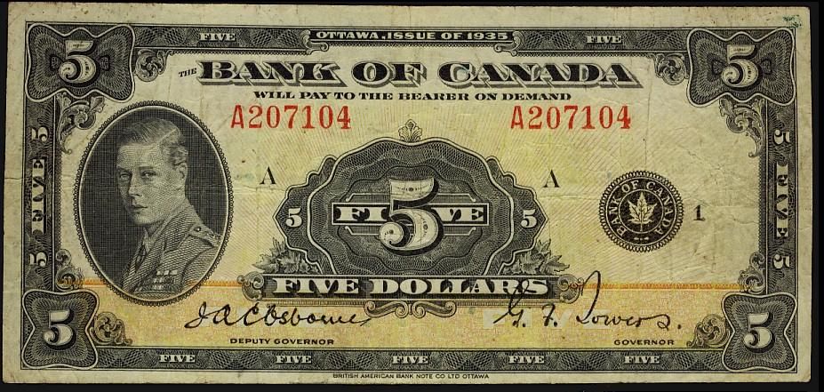 1935 $5 BC-5 #A207104. Nice note in F+ condition.
