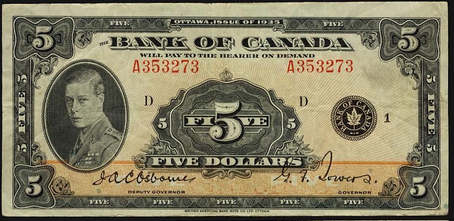 1935 $5 BC-5 #A353273. Bright colours, VF+.