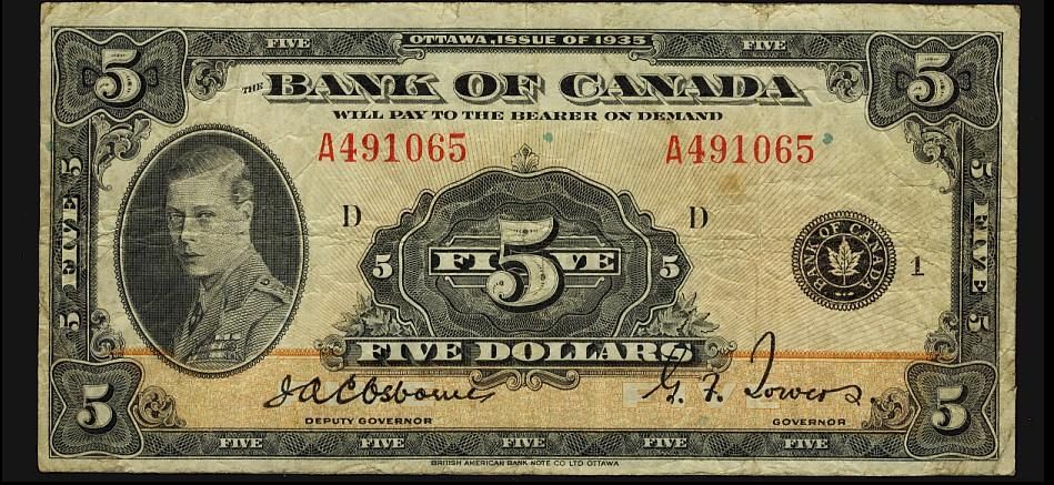 1935 $5 BC-5 #A491065. Nice note in F+ condition.