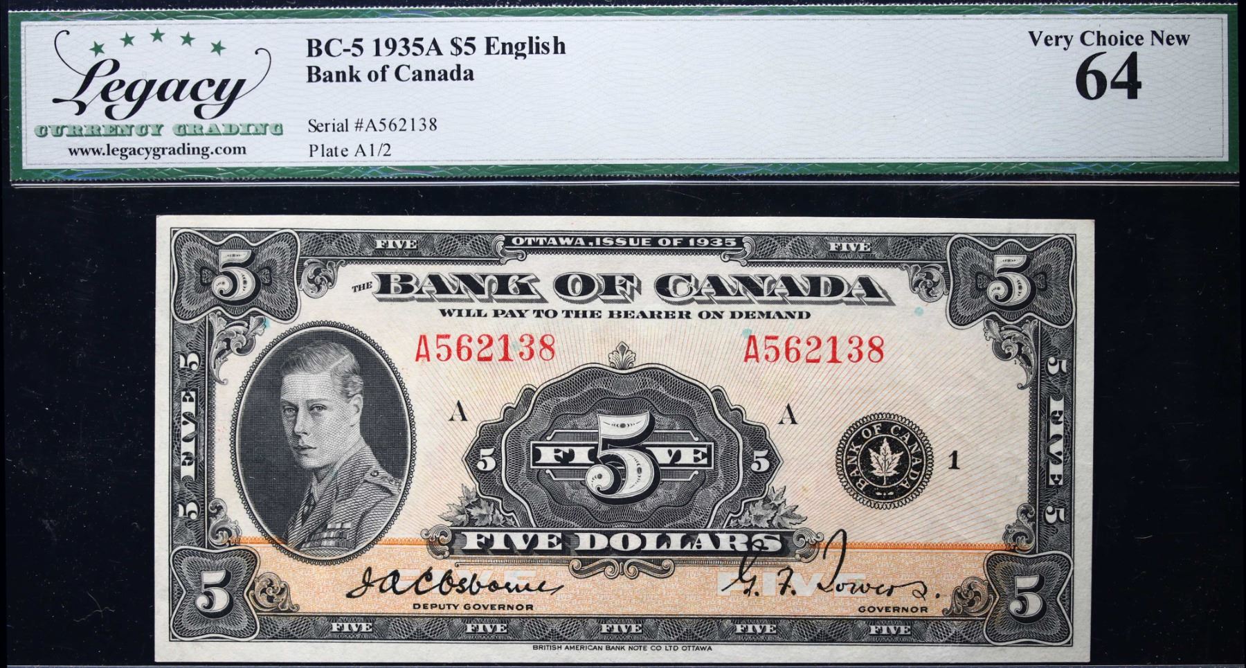 1935 $5 BC-5 #A562138 LCG Choice Uncirculated-64, A bright example with very nice centering. An appealing note.