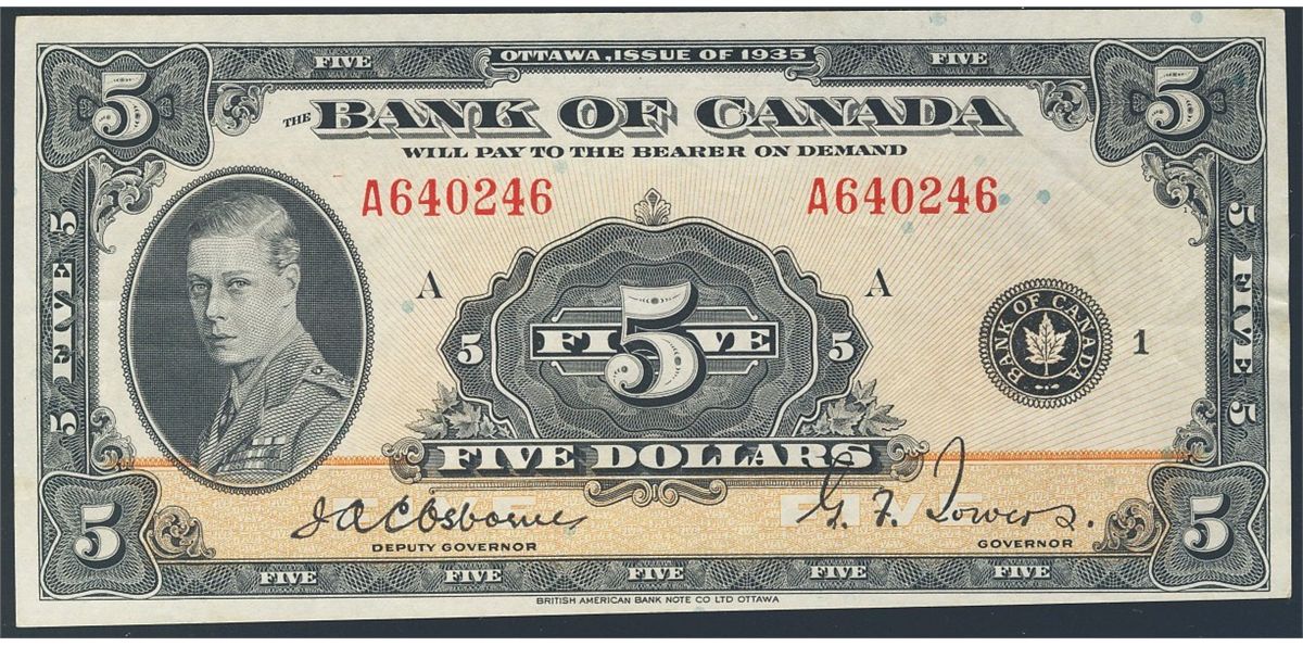 1935 $5 BC-5 #A640246 PMG AU50. Vibrant colours and quite attractive.